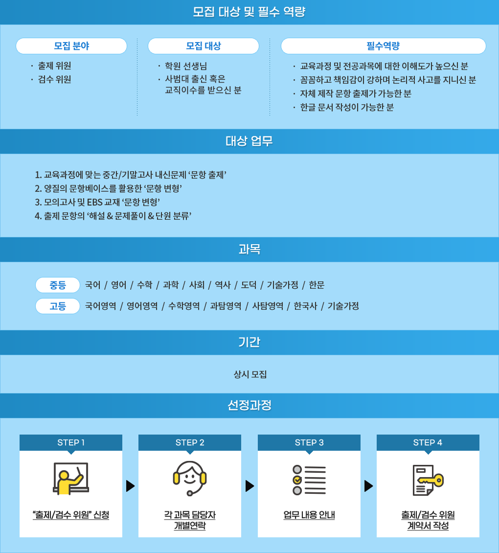 ¡°±³À°°úÁ¤¿¡ ¸Â´Â ¹®Ç× ÃâÁ¦ ¹× ½ÇÀü¿¡ ÇÊ¿äÇÑ º¯Çü ¹®Á¦¸¦ Àü¹®ÀûÀ¸·Î ÃâÁ¦ ¹× °Ë¼ö¡± ÇØÁÖ½Ç ½Ç·Â ÀÖ´Â ¼±»ý´ÔµéÀ» ¸ðÁýÇÕ´Ï´Ù.